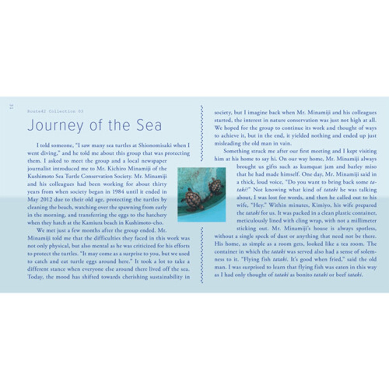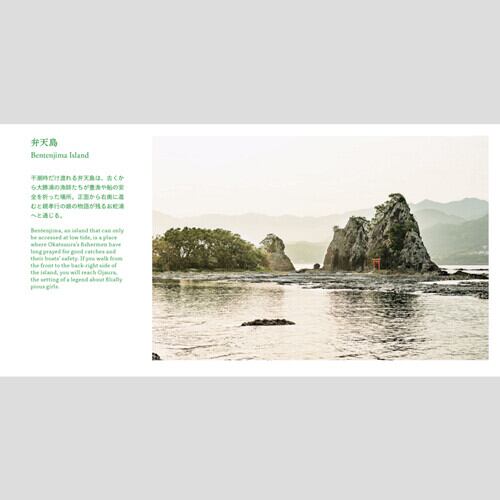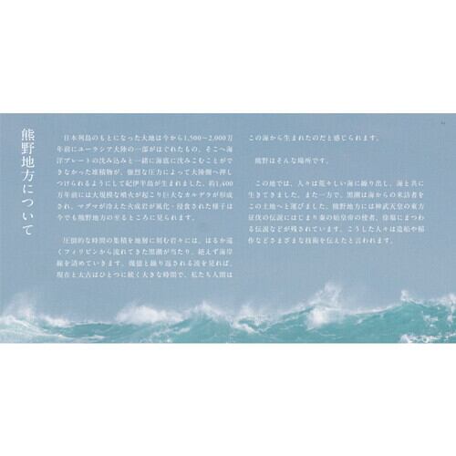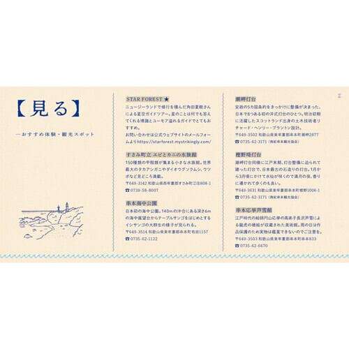 本書で紹介する和歌山県南部のエリアは、本州最南端に位置する串本町を境に、紀伊半島を東西に分ける形で東牟婁郡、西牟婁郡と分かれている。 本州最南端の潮岬から、徐々に東西で景色のトーンが変わり、それぞれ異なる表情を見せる。東牟婁郡から潮岬まて?は明るく、光か?多く、爽快でダイナミック。古座川町から那智勝浦町、太地町、新宮市と東へ向かうにつれ海や森はトーンを落とし、総じて神秘的な雰囲気をまとっている。東牟婁郡には世界遺産、熊野古道があることから海外の観光客が多いが、人々が西牟婁にまで足を運ぶことはなかなかない。しかし、華やかな観光スポット以外にも見落とすべきではない美しい景色が、西牟婁にはまるで小さな宝石のように点在する。国道42号線でひとつにつながった海沿いの美しい風景写真をポストカードとしても楽しめる。