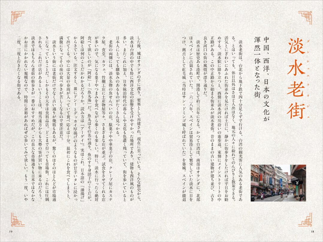 ■目次・北部迪化 全長一キロ、古さと新しさが同居する台湾一の問屋街淡水 中国、西洋、日本の文化が渾然一体となった街鶯歌 百軒以上の陶磁器店が並ぶ「台湾の景徳鎮」三峡 若者に大人気、赤レンガの美しいアーケード街頭城 歴史情緒あふれる素朴で趣のある老街新荘 夜市もお勧め、ガイドブックに載らない穴場的老街瑞芳 B級グルメのメッカ、古さと新しさが同居する街九份 映画のロケ地で復活した旧金鉱の町十分 町おこしに成功した「ランタン上げ」発祥の街平渓 ゆったりとした時間が流れるローカル色豊かな老街青桐 日本式木造駅舎を中心に、箱庭のような可愛い老街大渓 バロック様式の壮麗な建物と美食の街