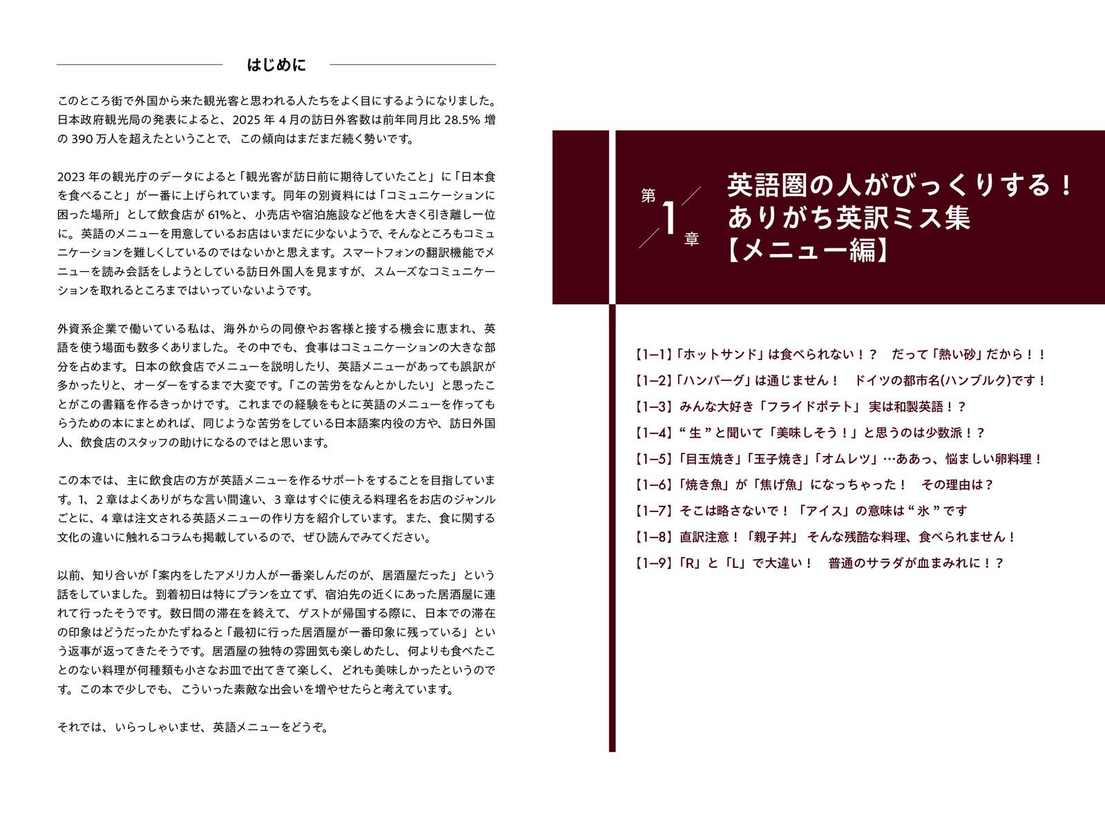 【編集者からのコメント】海外で飲食業の起業やマーケティングを学んだ経験を持つ著者・岸雅之さん。本書は、仕事で訪日客を案内するなかで「もっとわかりやすいメニューがあれば…」という思いから生まれました。観光庁の調査によれば、訪日外国人が最も期待しているのは「本場の日本食を味わうこと」。しかし、メニューが十分に伝わらず、せっかくの来店機会を逃してしまうお店も少なくありません。本書は、そんな現場の課題に応える一冊。飲食店の方はもちろん、日本食の魅力を世界に届けたいすべての方に役立つ実践的な内容です。